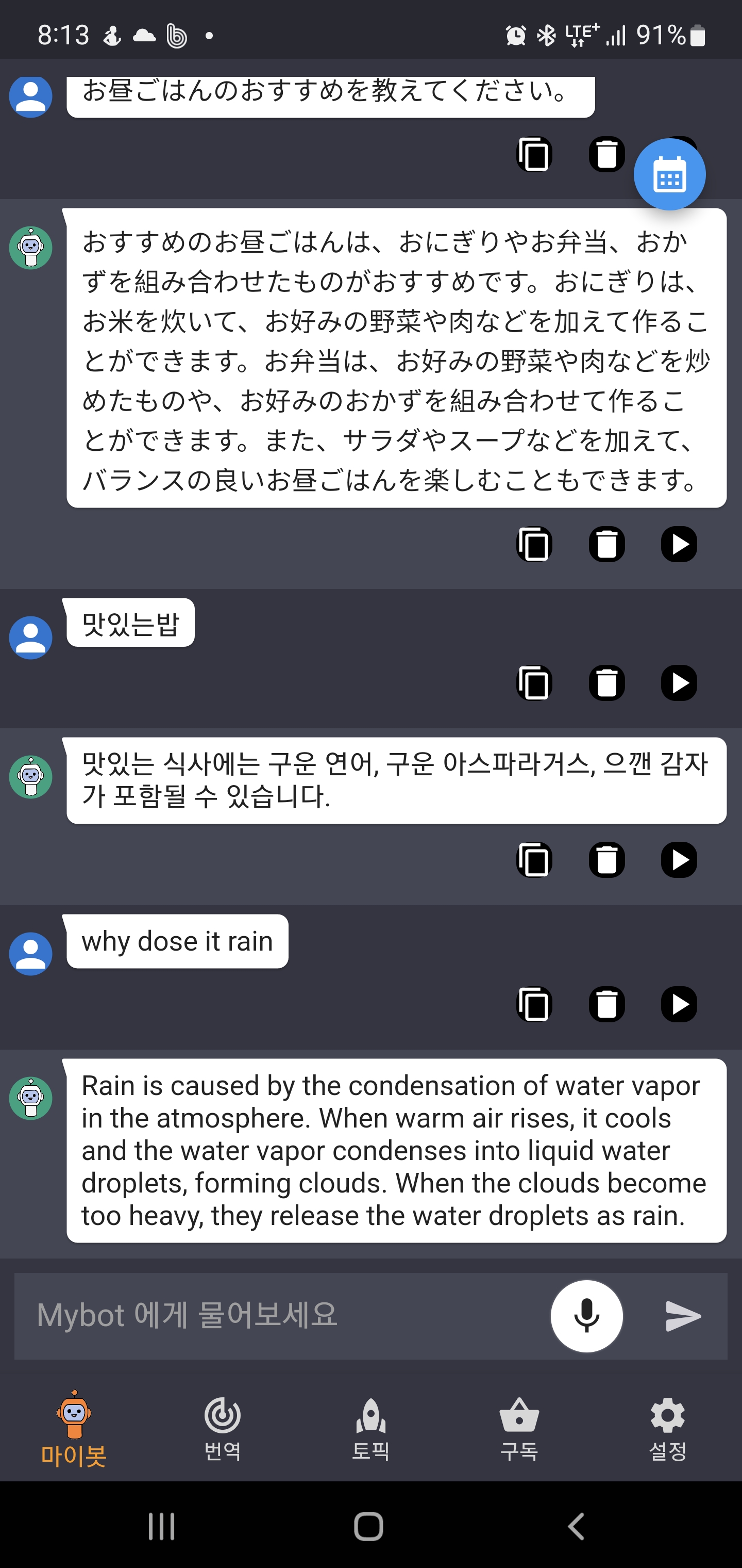 마이봇이란? 인공지능을 회수한 채팅봇으로, 음성 TTS 서비스와 다이어리를 통해 *토픽을 관리하고, 토픽을 생성해 사용자들과 관찰할 수 있습니다. ■ 생성된 토픽을 클립보드에 저장하여 다