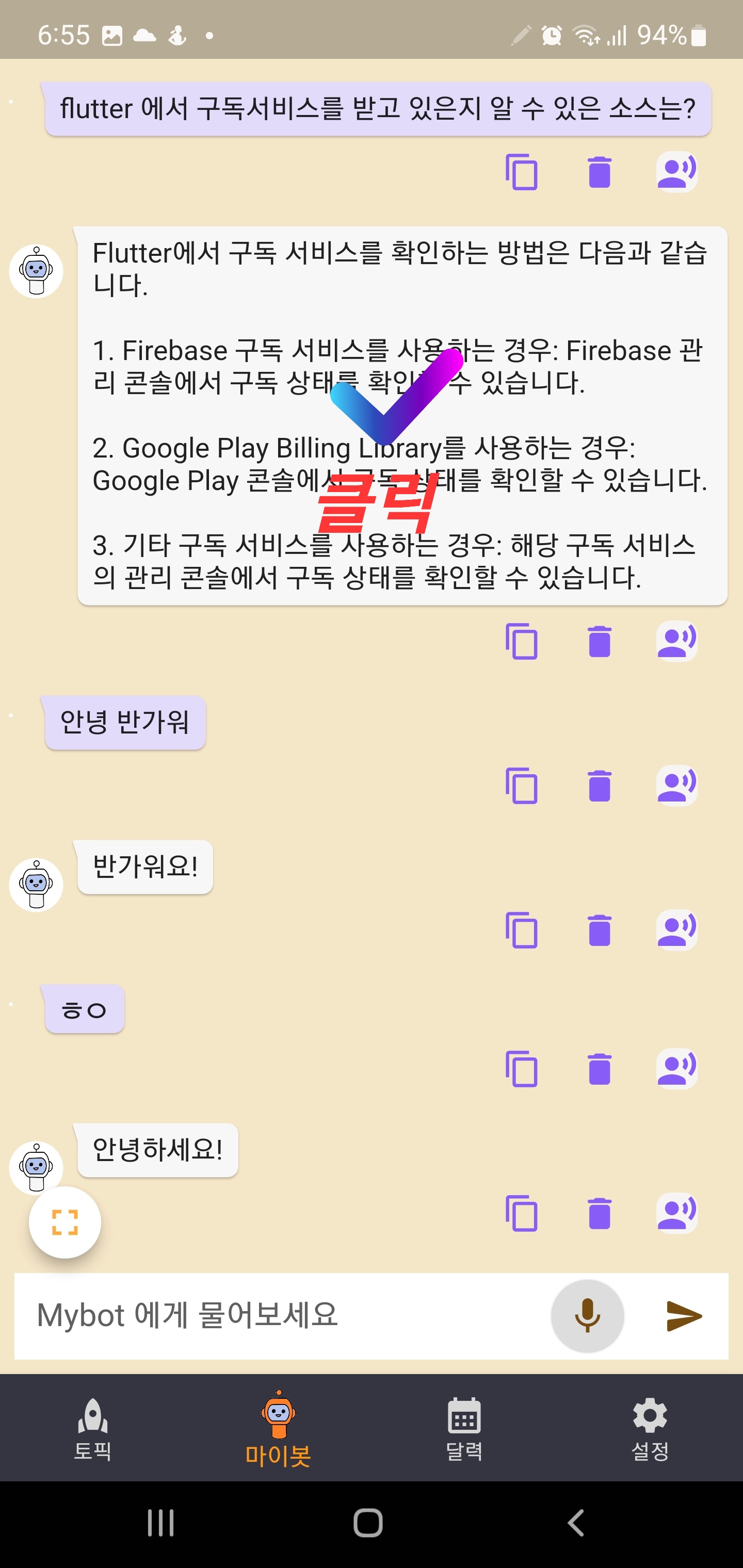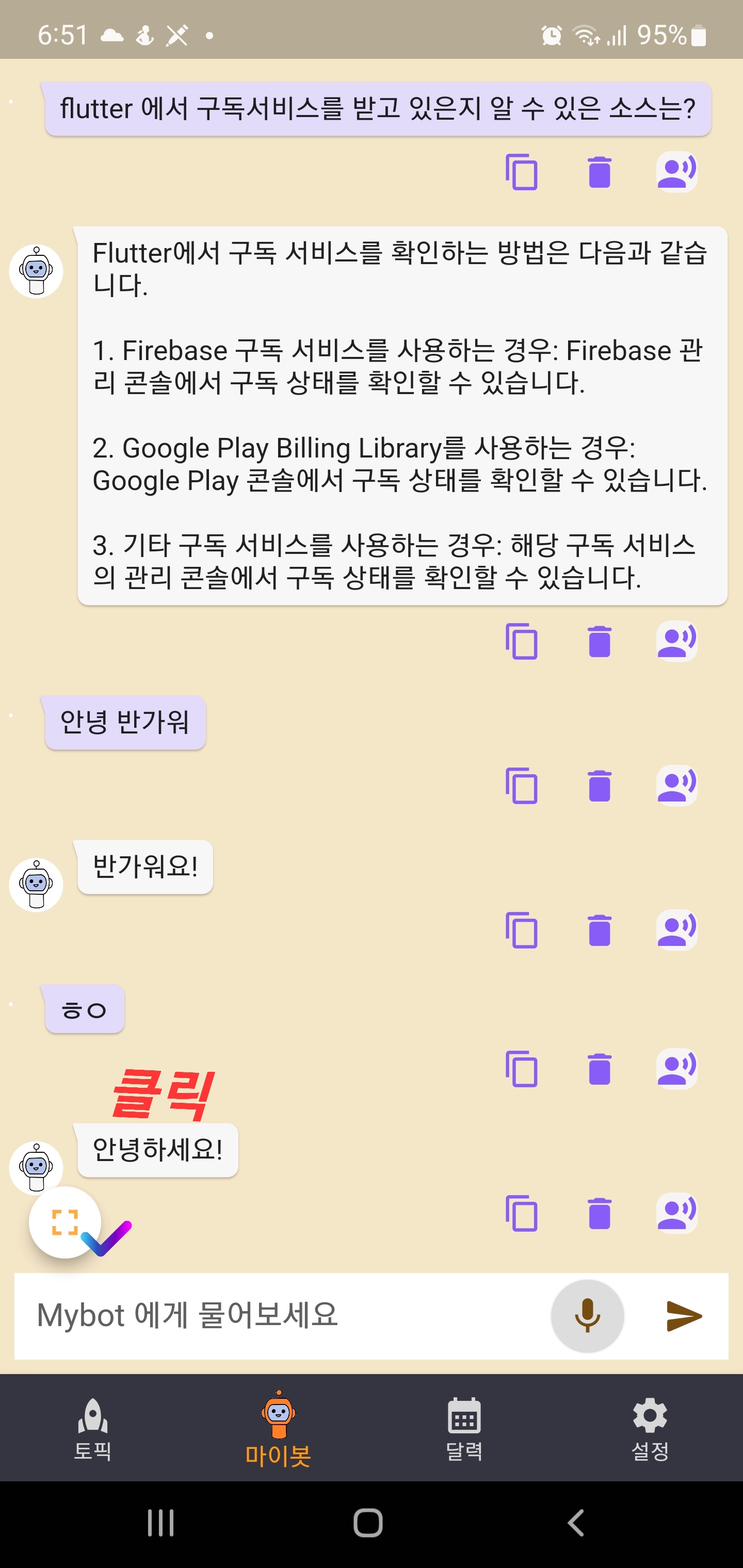 마이봇이란? 인공지능을 채팅봇으로, 음성 TTS 서비스와 다이어리를 통해 *토픽을 관리하고, 토픽을 생성해 사용자들과 관찰할 수 있습니다. ■ 생성된 토픽을 클립보드에 저장하여 다른 검색