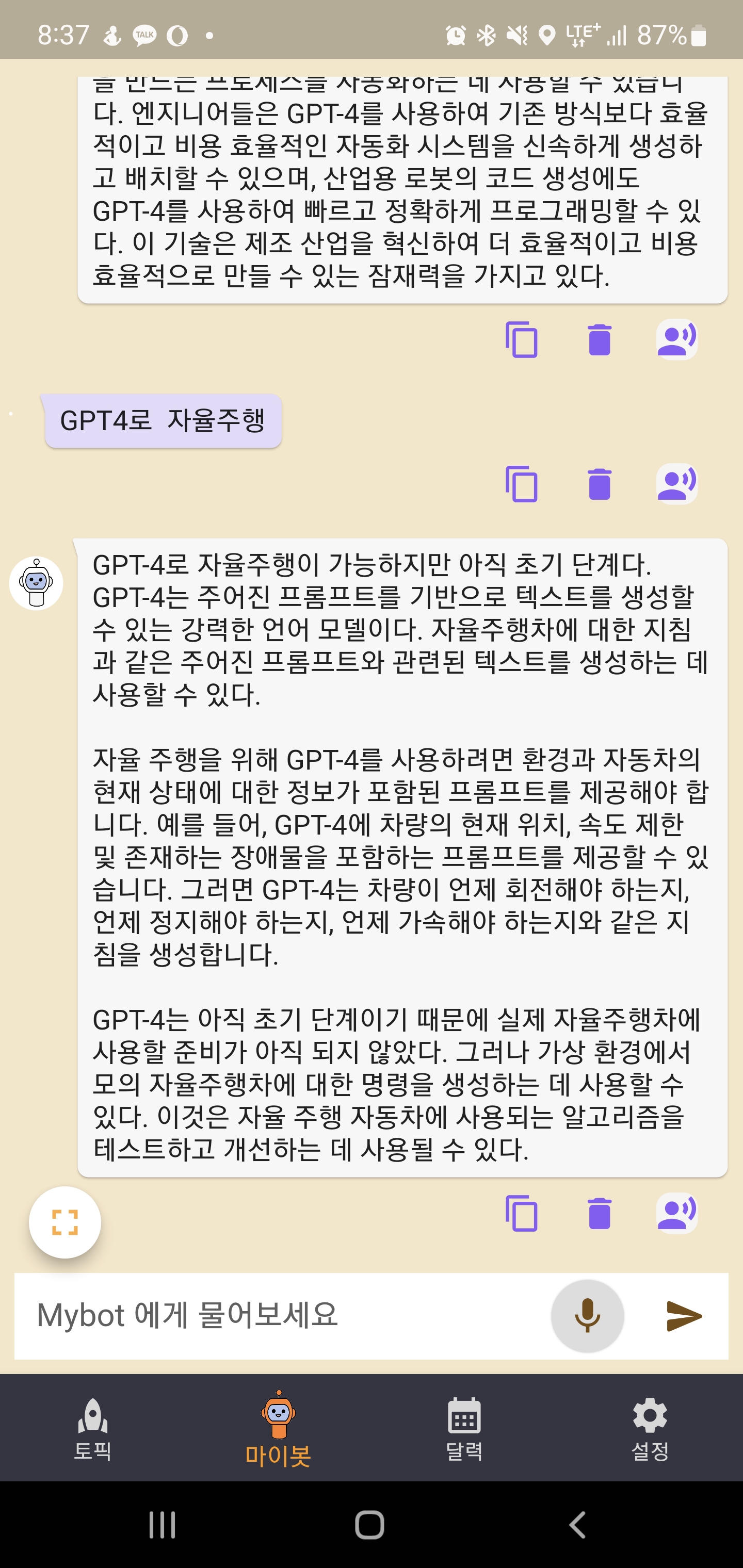마이봇이란? 인공지능을 채팅봇으로, 음성 TTS 서비스와 다이어리를 통해 *토픽을 관리하고, 토픽을 생성해 사용자들과 관찰할 수 있습니다. ■ 생성된 토픽을 클립보드에 저장하여 다른 검색