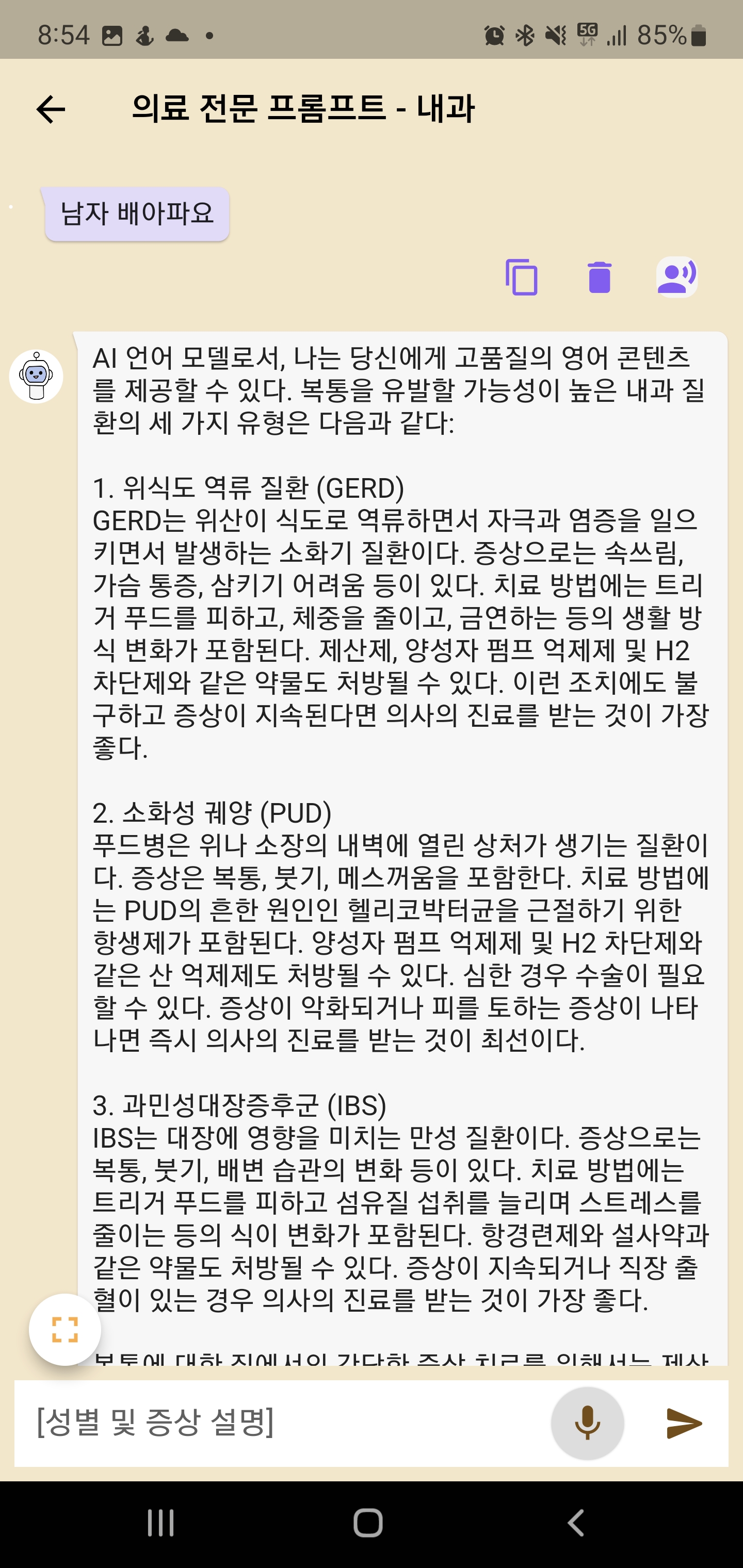 AI 언어 모델로서, 나는 당신에게 고품질의 영어 콘텐츠를 제공할 수 있다. 복통을 유발할 가능성이 높은 내과 질환의 세 가지 유형은 다음과 같다:
