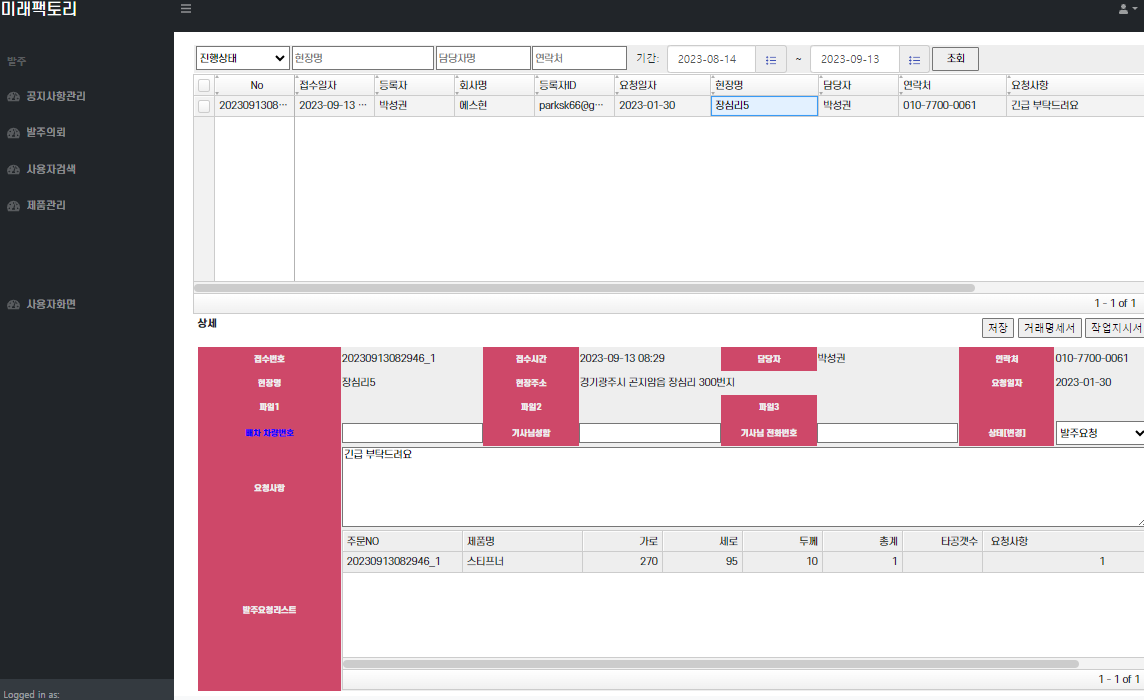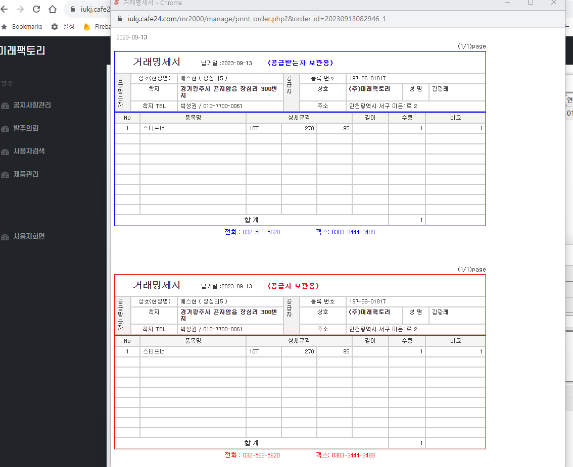 관리자 화면에서 발수내역및 거래명세서 작업지시서등을 출력하여 송장을 전달할수있다.