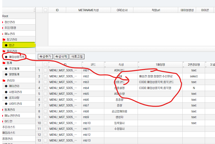 우선 메타 관리에서 아래처럼 입고 메뉴에서 CODE 라고 하고 품목 테이블을 설정한다.