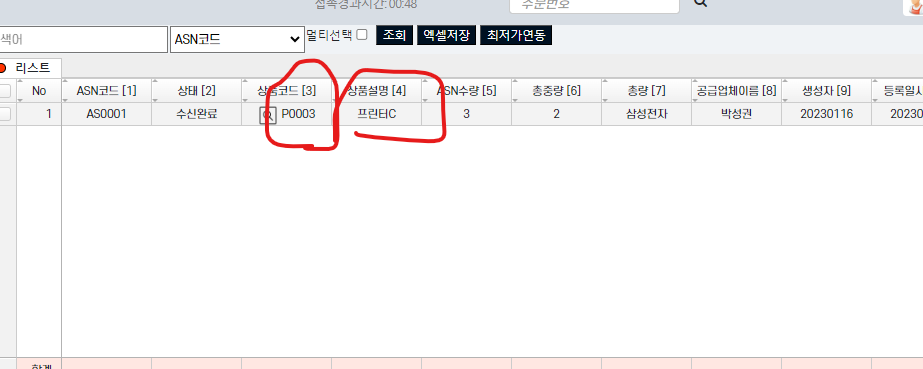 클릭해보면 목록을 가져오는것을 알수있다. 그럼 목록에서 선택하면 상품설명컬럼과 상품코드를 가져오는것을 알수있다.