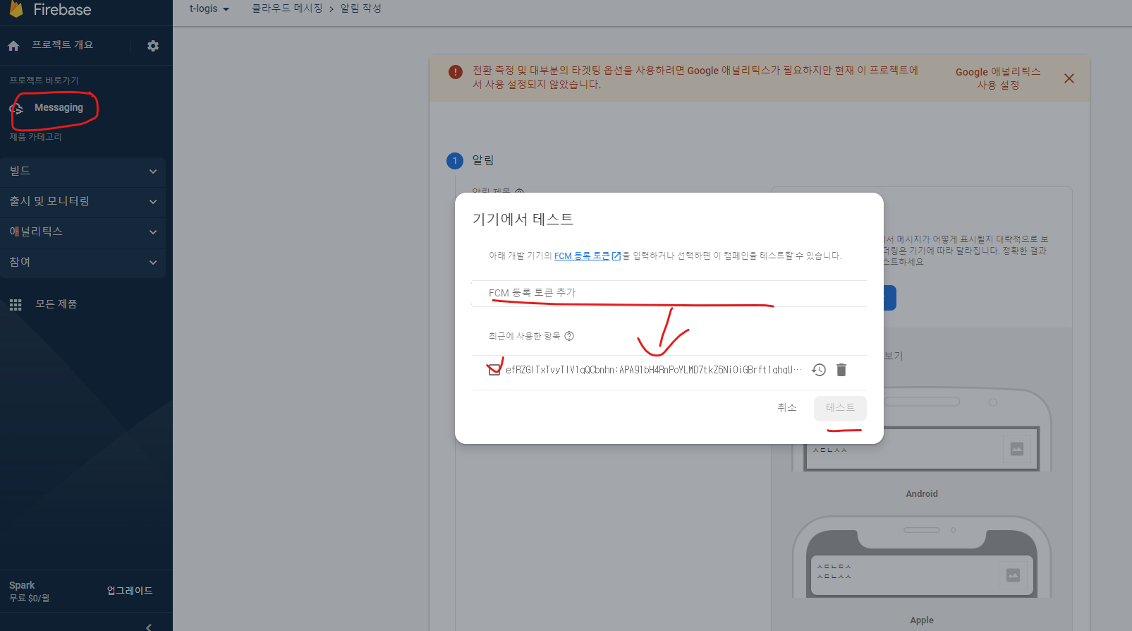 firebase 에서 테스트로 캠페인 메세지를 보내봄
