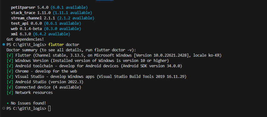 PS C:\git\t_logis> flutter doctor (나의 플터러 적용환경)