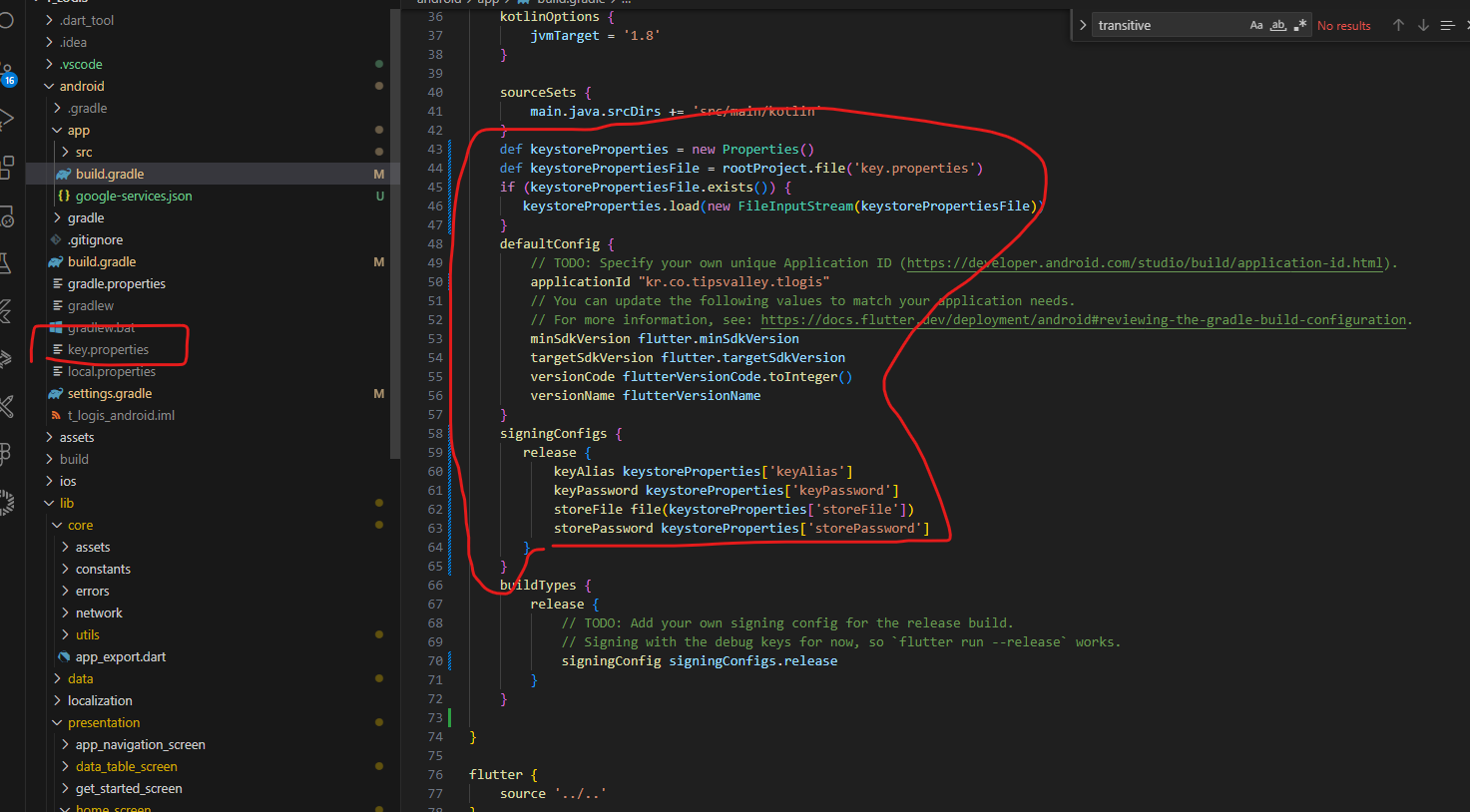 KEY 파일 생성후( 다른 문서참조) 플러터 소스에 적용예