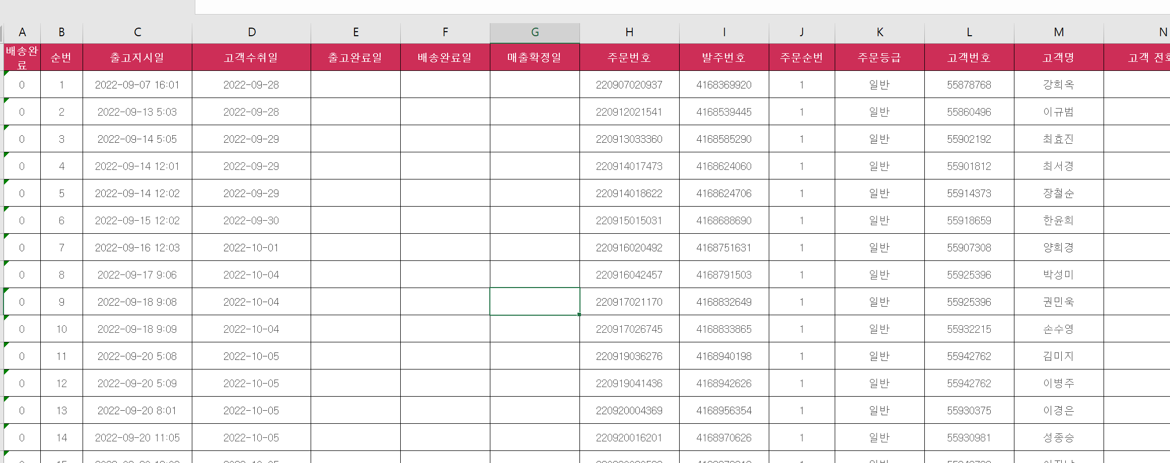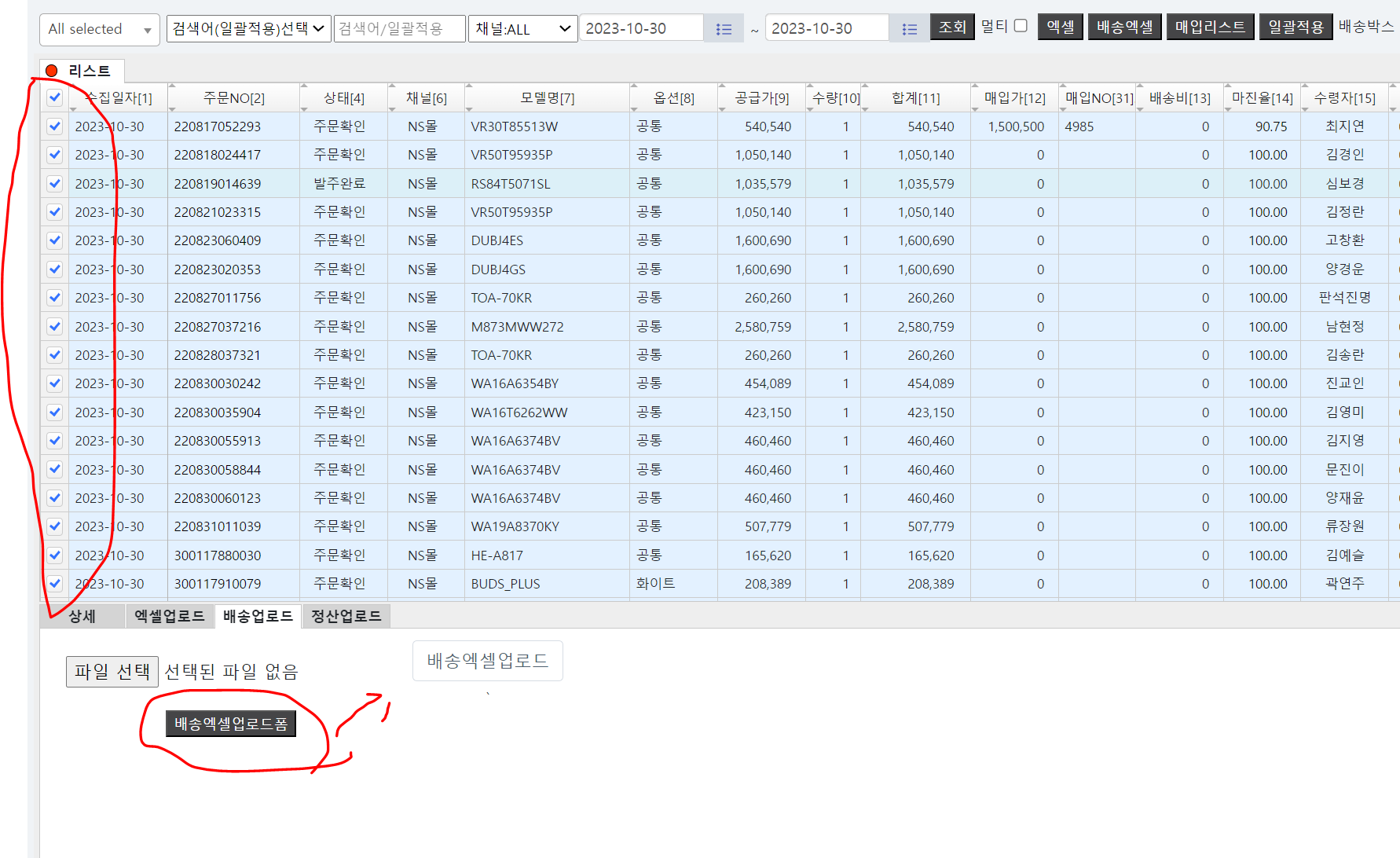 1. 주문 리스트 : 각 매출 주문(채널:각오픈마켓:예)옥션,지마켓,11번가 )별 엑셀로 다운로드한 데이터를 매일 올린다.