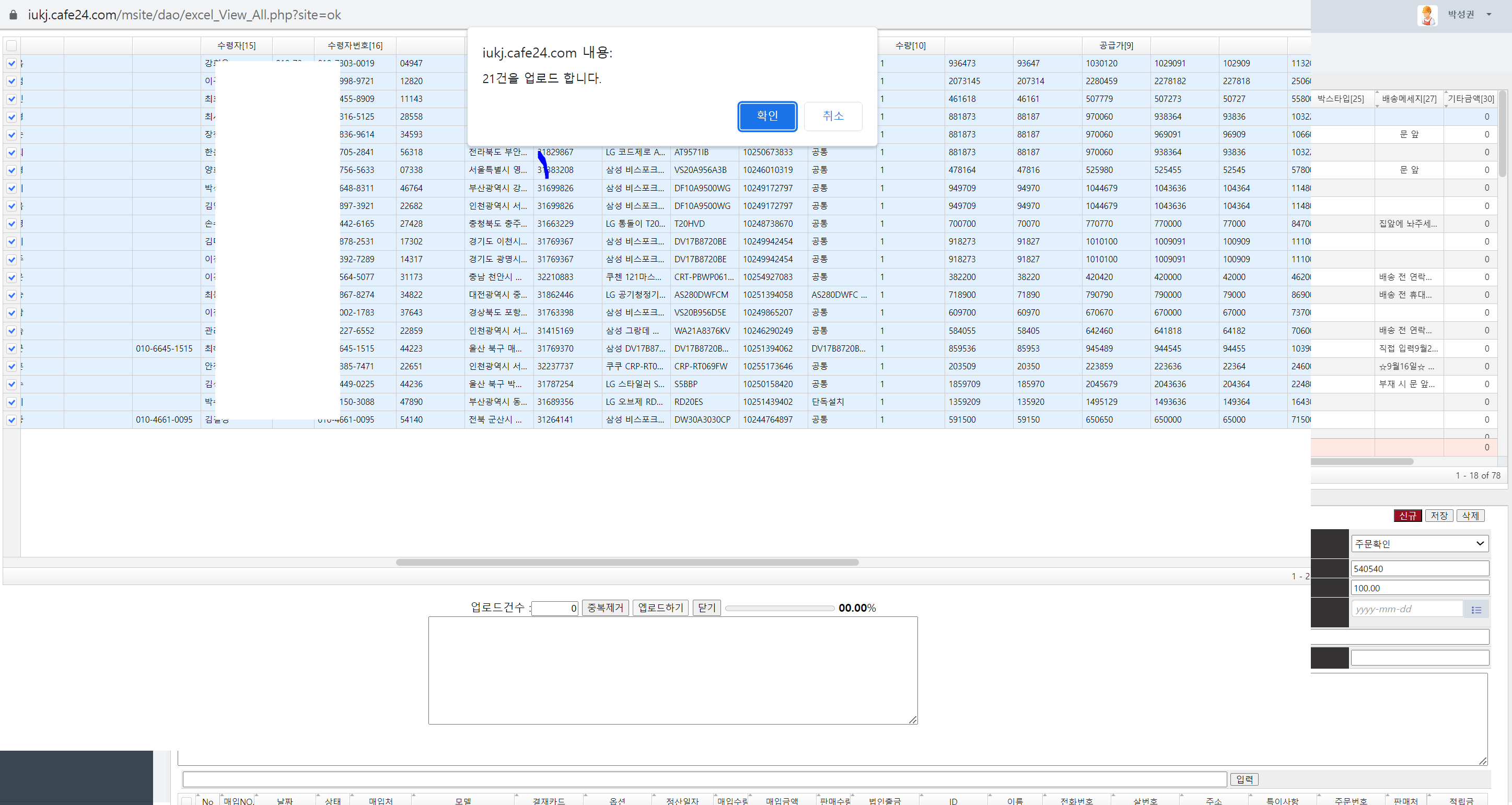 - 주문 리스트 : 각 매출 주문(채널:각오픈마켓: 예)옥션,지마켓,11번가 )별 엑셀로 다운로드한 데이터를 매일 올린다.