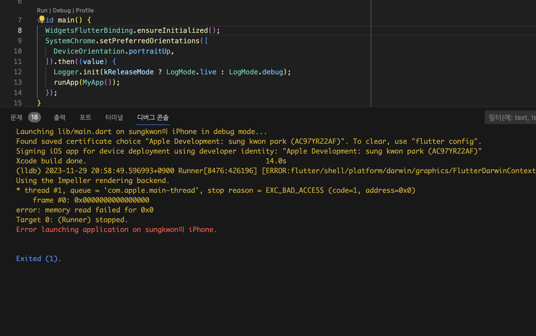 end이처럼 수정하고 다시 실행하니 pod install을 수행한 이후 빌드되어 정상적으로 아이폰에서 앱 구동이 되는 것을 확인했습니다.