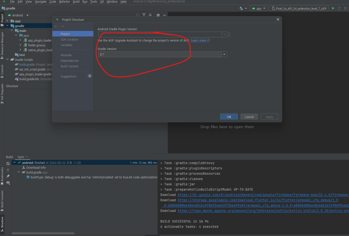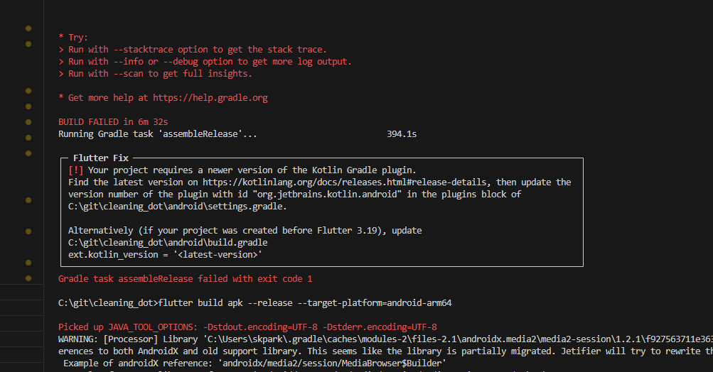 플러터 버전 3.19 이상으로 업데이트 하면서 코틀린 버전에 문제가 생긴것같다.