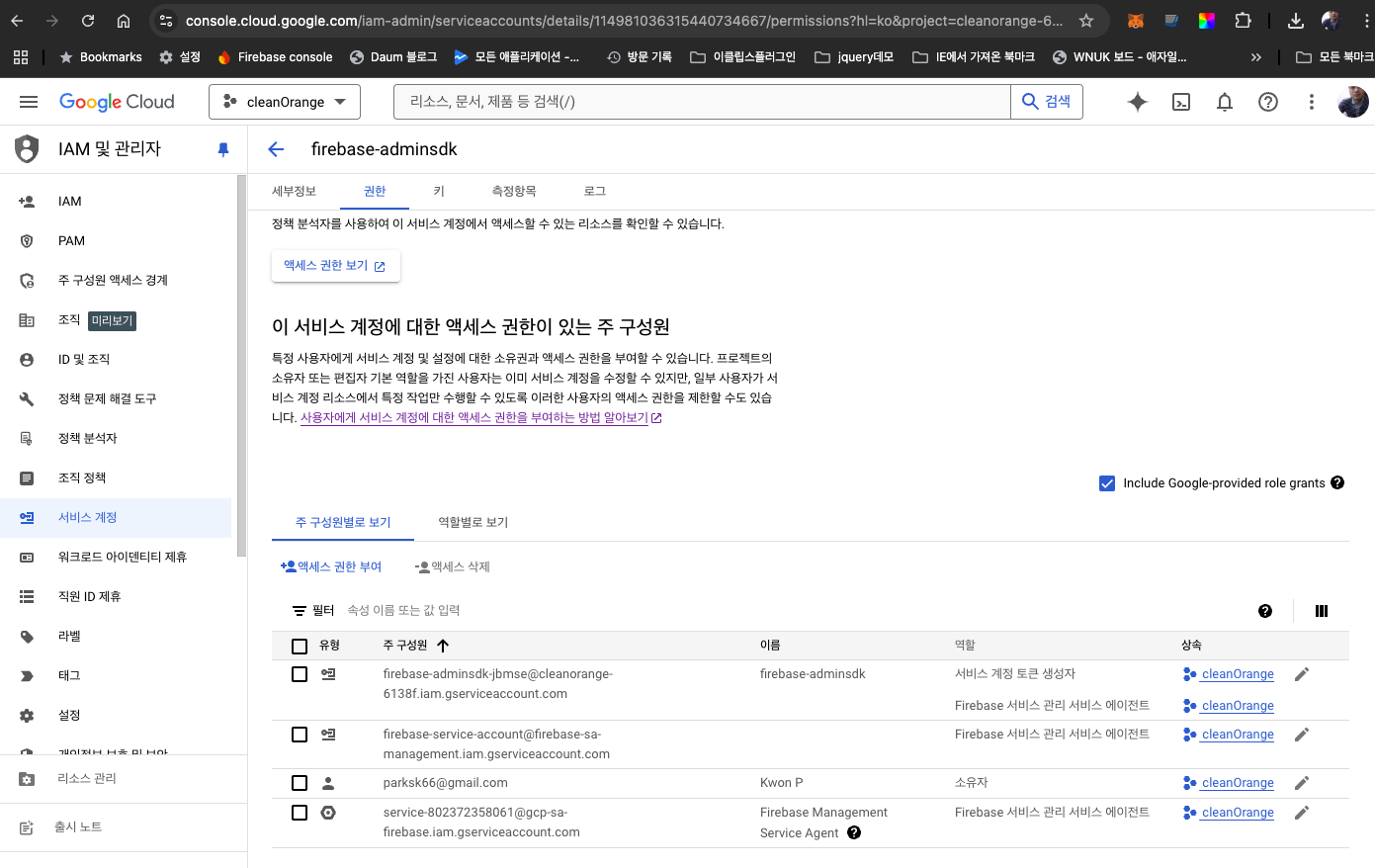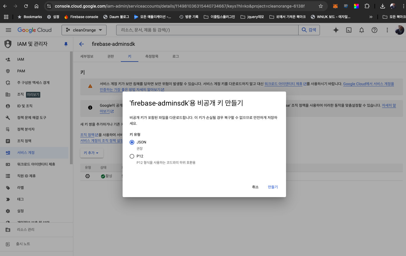 키값을 추가하고 json 파일을 받기위해 IAM 및 관리자로 들어간다.