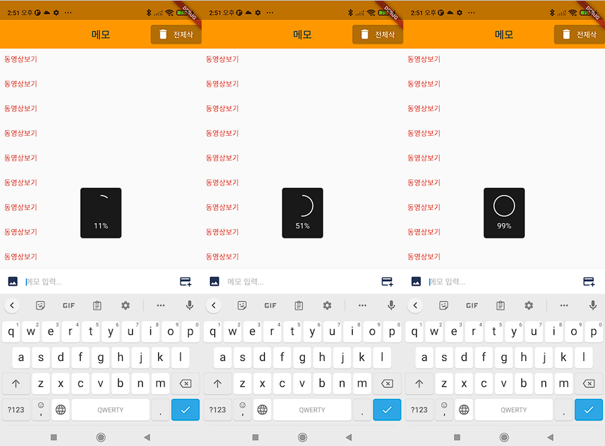 - 그런데 받아온 프로그래스 진행%를 화면에 뿌리기위해 Easyloading 을 이용하는데 바로 적용은 안돼고 StatelessWidget 을통해 EasyLoading.init() 초기화화고 home 을 statefulWideget으로 감싸야 한다. 이것 때문에 한참 해맷다.