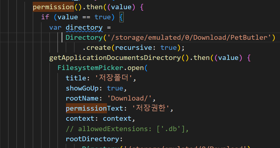 - 필요한 퍼미션 : Permission.manageExternalStorage 를 넣거나 다른걸루 바꾸면된다.