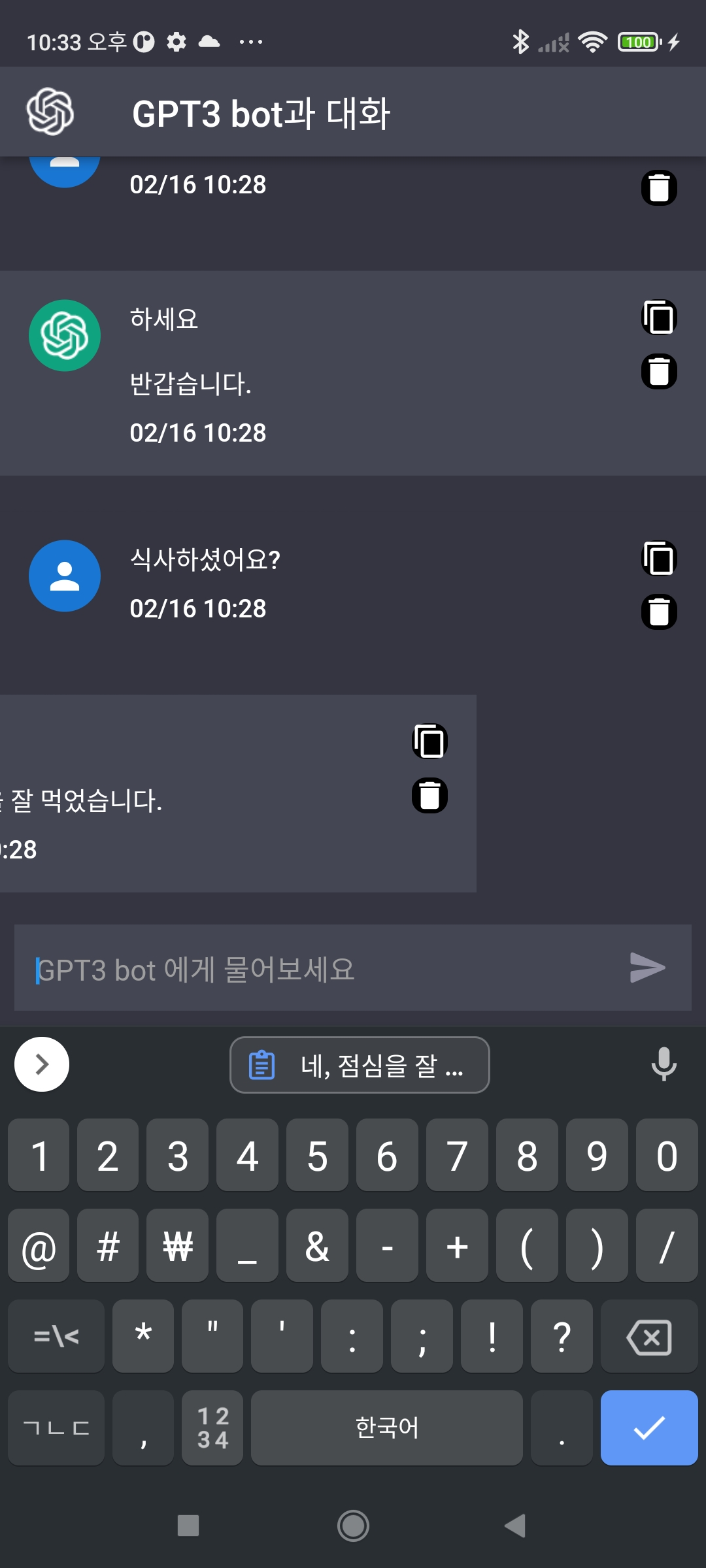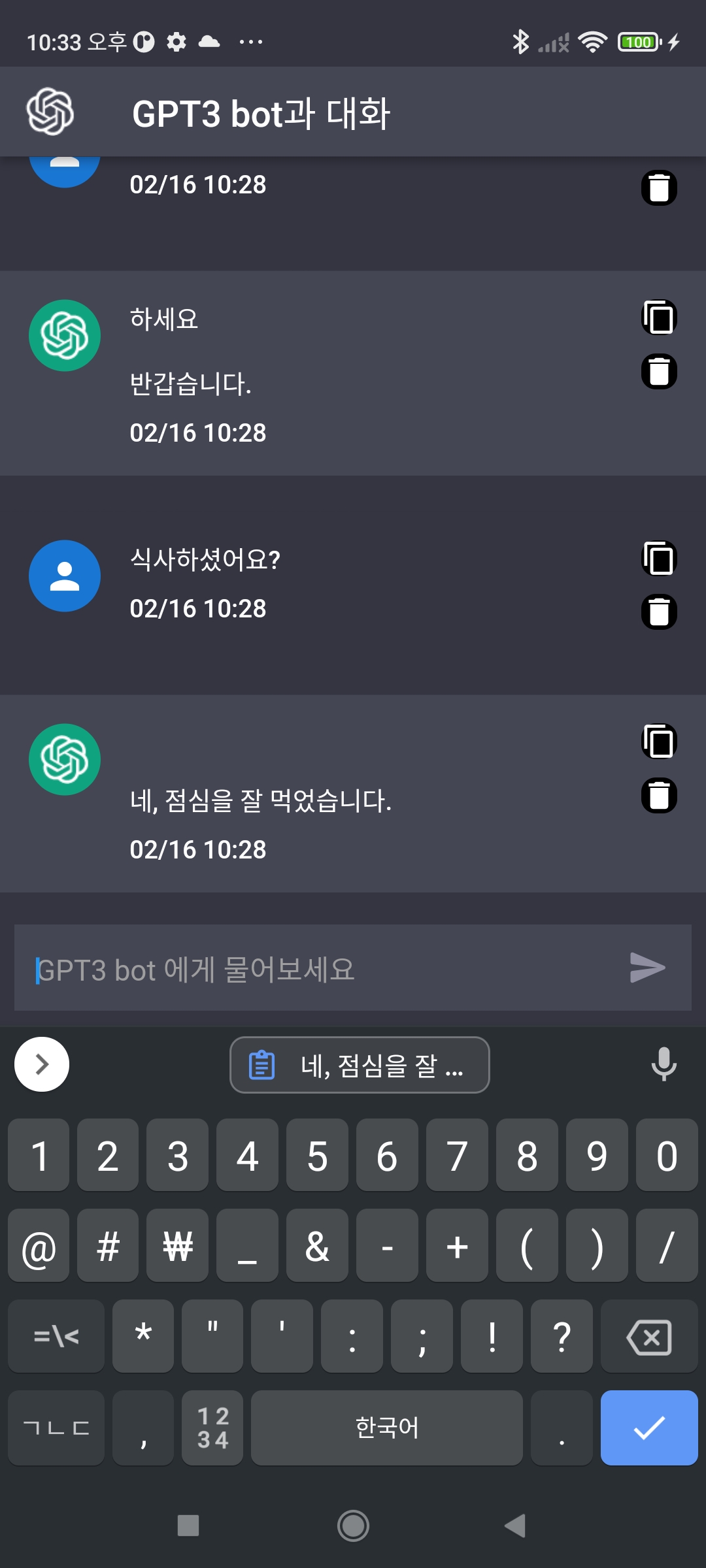 - 문답기록은 sqlite 를 통해 저장하고 초기 로딩시 불러오게 만들었다.