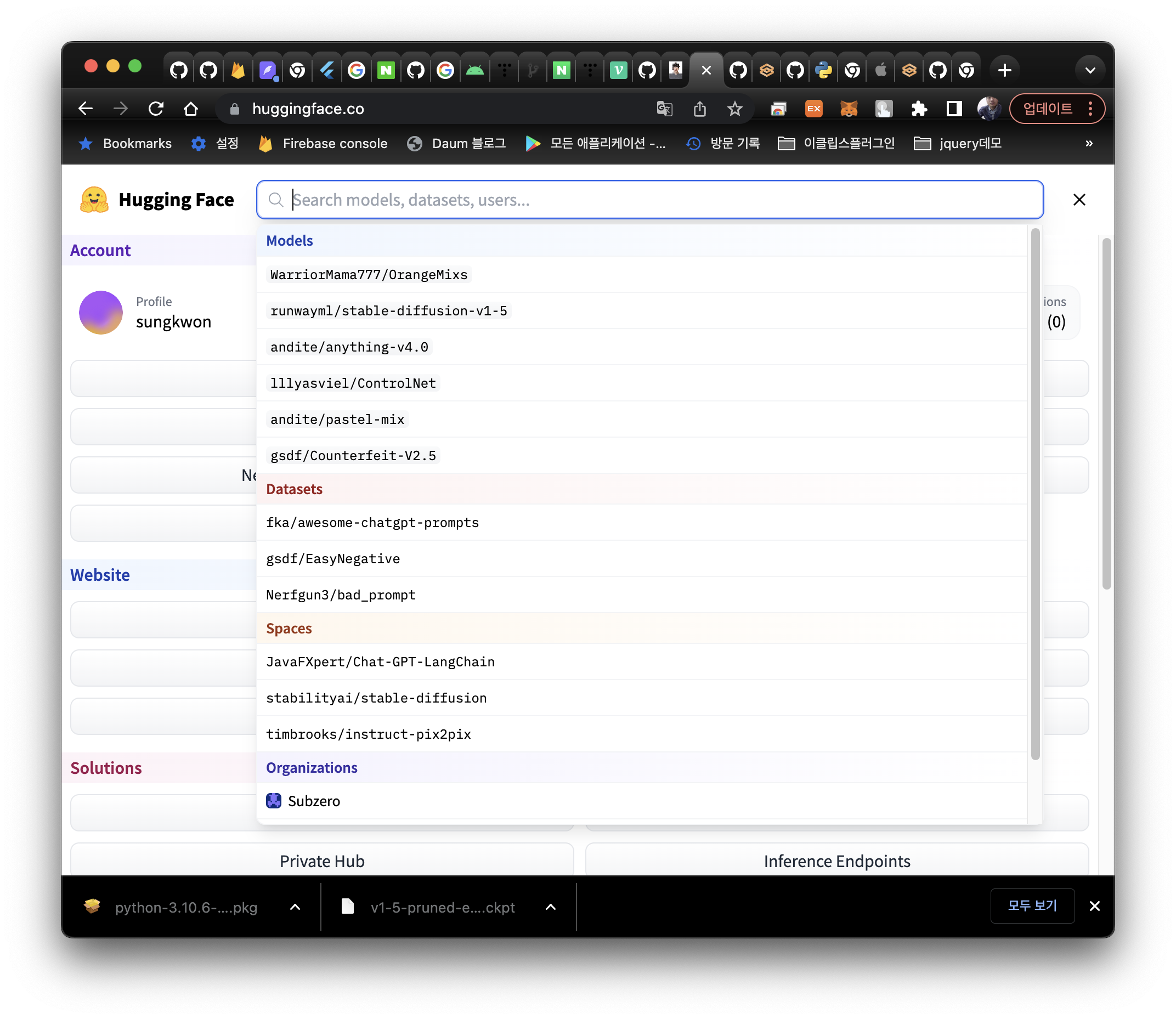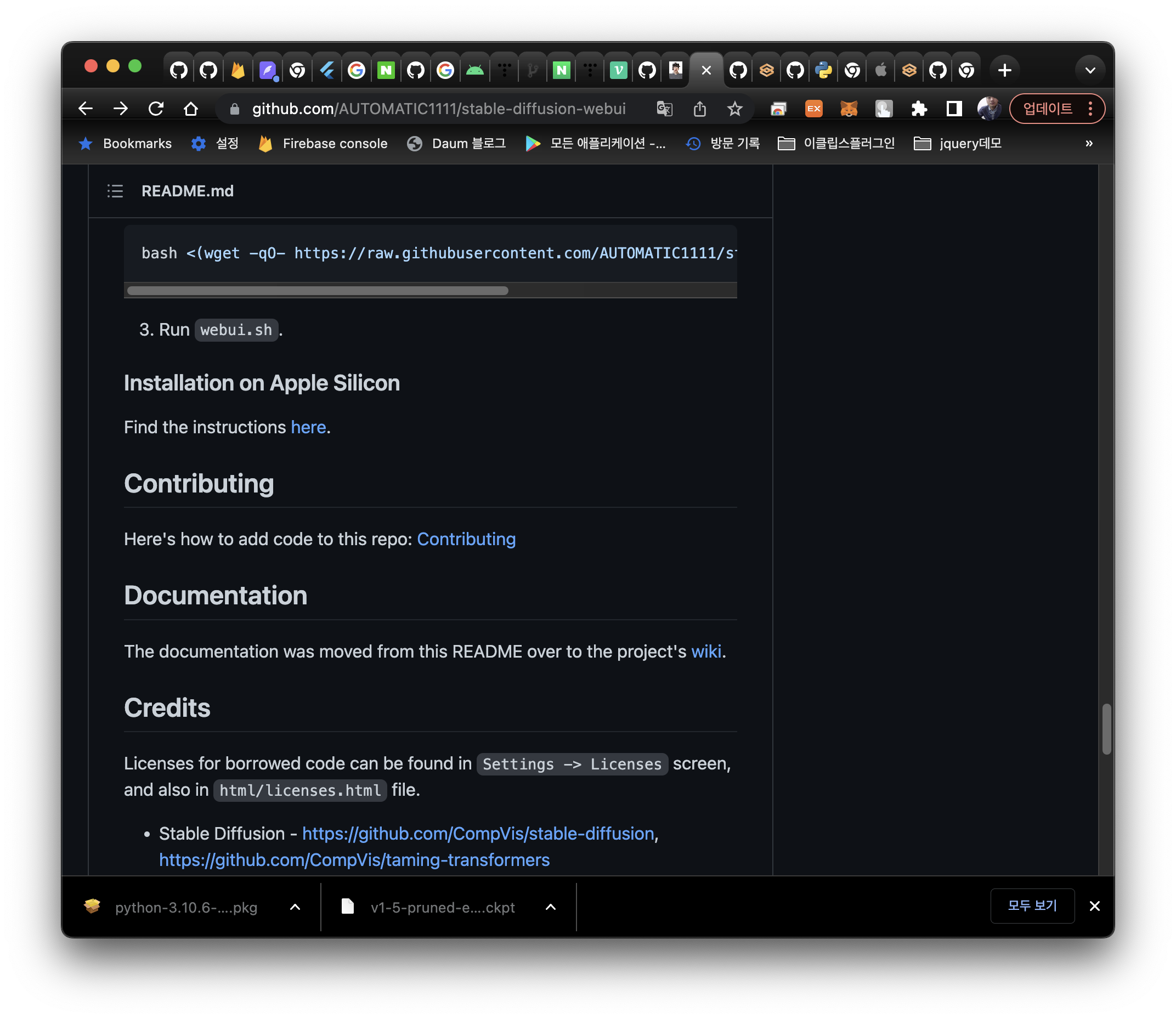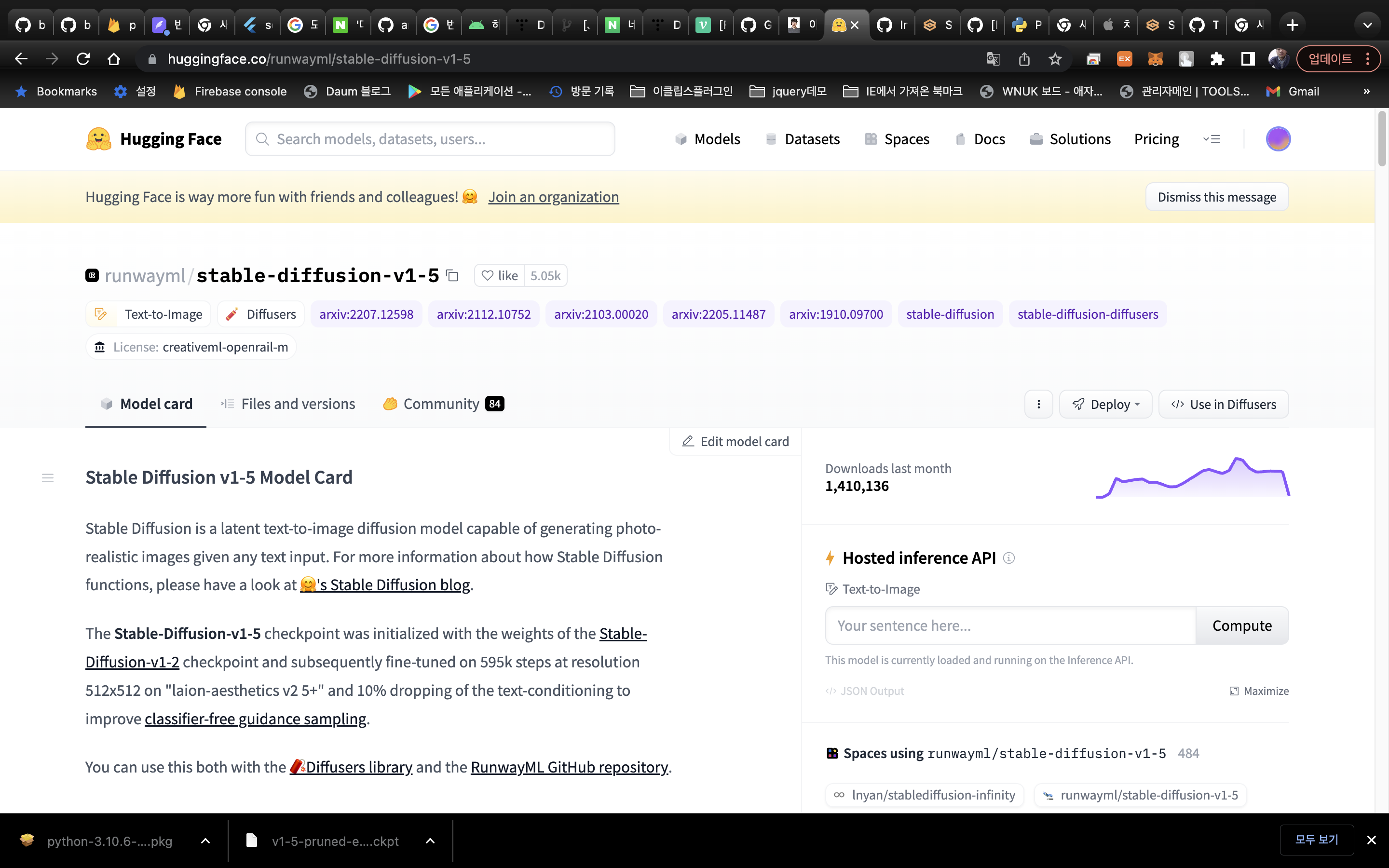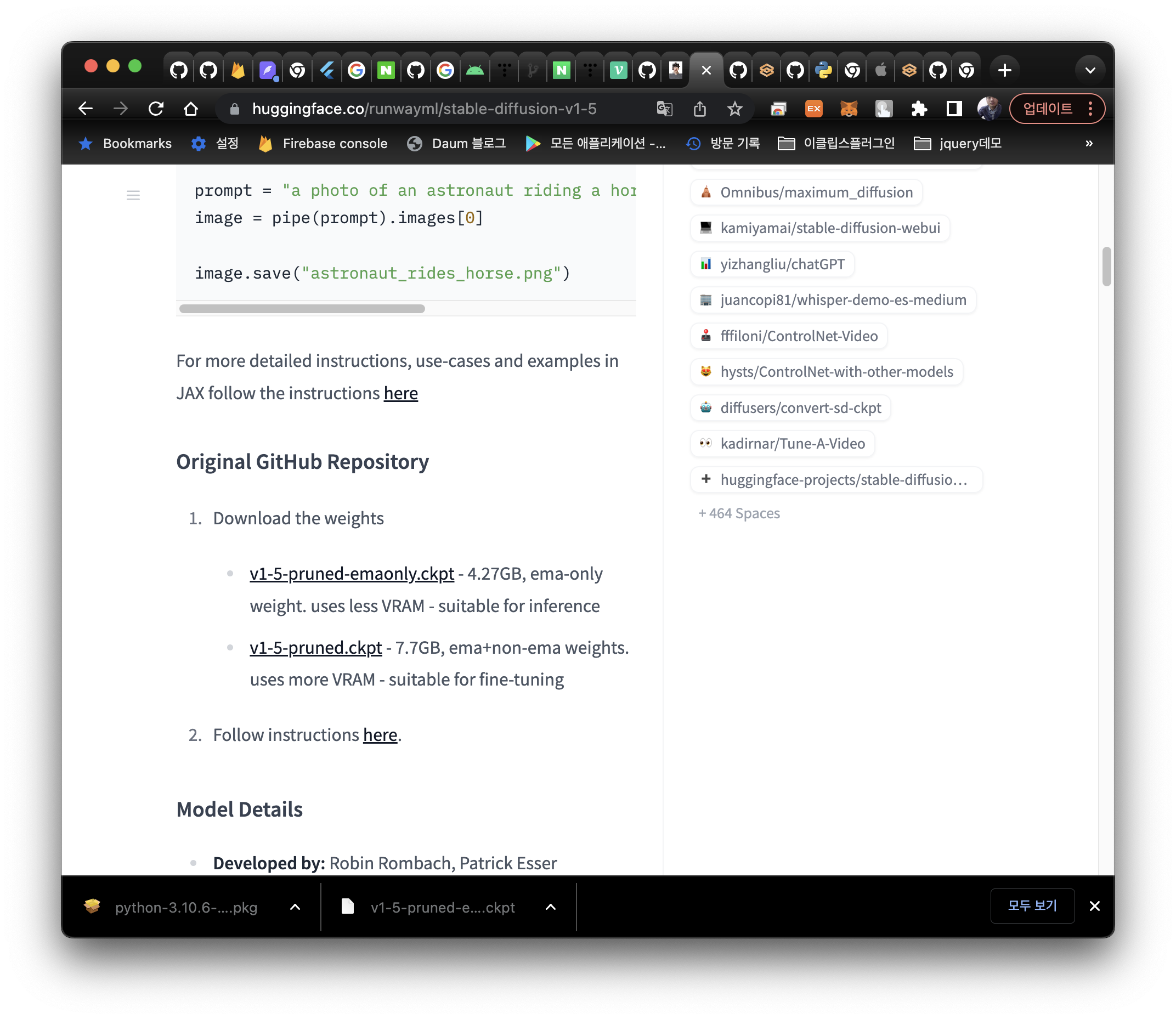 아래 다운로드 파일을 받아서 해당 폴더에 넣는다 /models/stable-diffusion/ 폴더